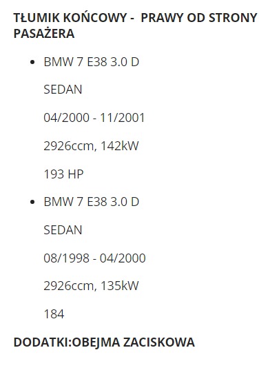 BMW 7 E38 3.0 D SEDAN 1998-2001 TŁUMIK KOŃCOWY PRAWY
