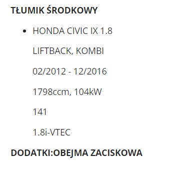HONDA CIVIC IX 1.8i VTEC KOMBI LIFTBACK 2012-2016 TŁUMIK ŚRODKOWY